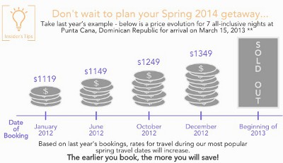 Club Med also sent us this helpful graph that shows how rates goes up the later you book. This will occur at most resorts in the Caribbean, Mexico and elsewhere and relates to airfares as well. If you can, plan early and SAVE!